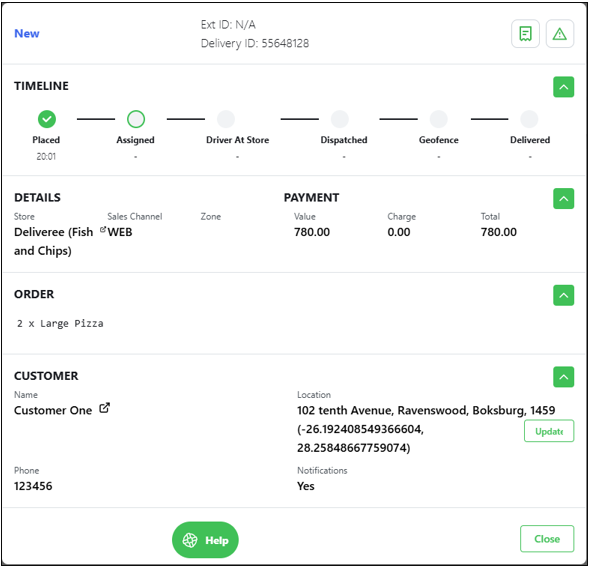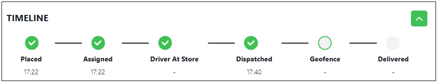 Next you will see if the order has been "Assigned", if the “Driver is at store" to pick up the order, if the order has been “Dispatched”, it the driver has reached the "Geofence" or if the order has been "delivered".