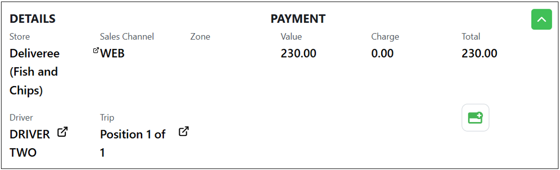 You will also see the store details and the driver who took the order and if the order was part of a group, you will see the position it was in the trip and if the order was paid it will show that the order was paid and the method of payment used.