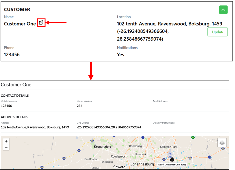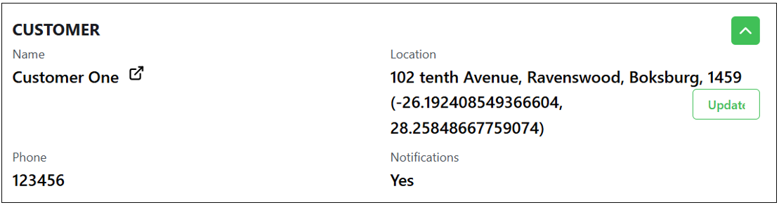 The customer’s details will be displayed as illustrated below, including the customer’s phone number and address. The address must always include the GPS coordinates.