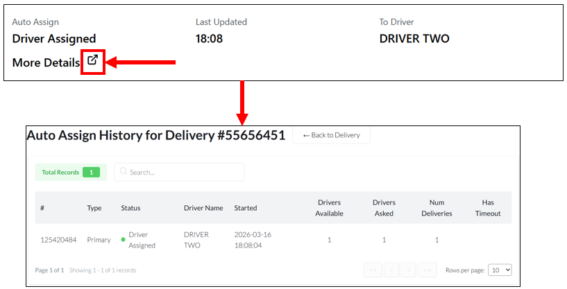 When you click the " show more details" button, you will display the Auto assign History for the order as illustrated below.